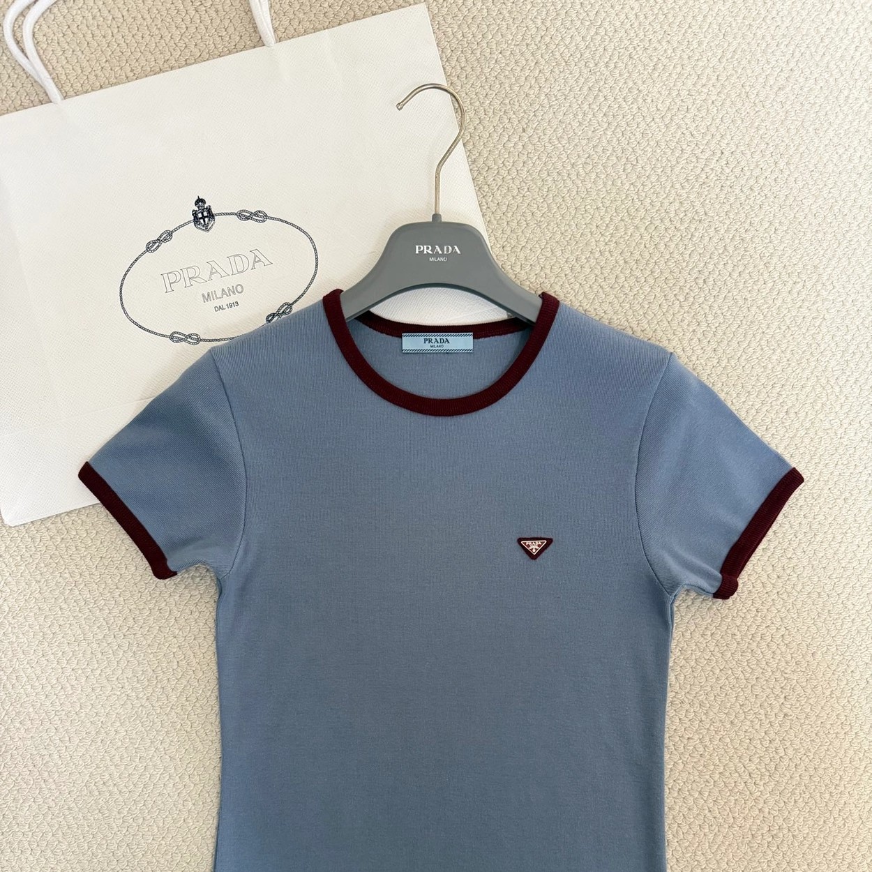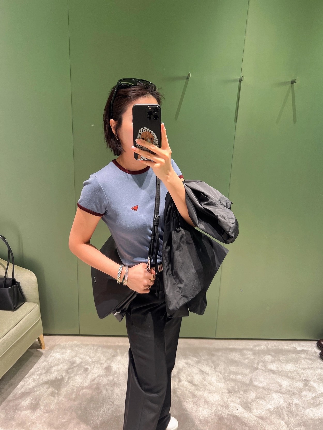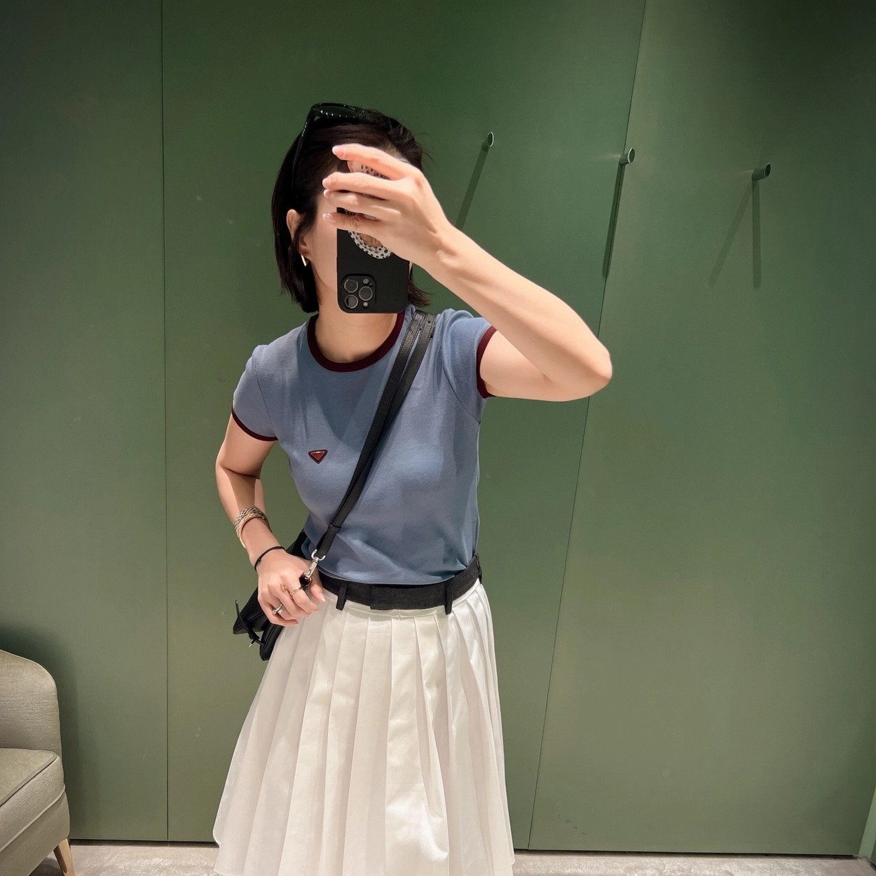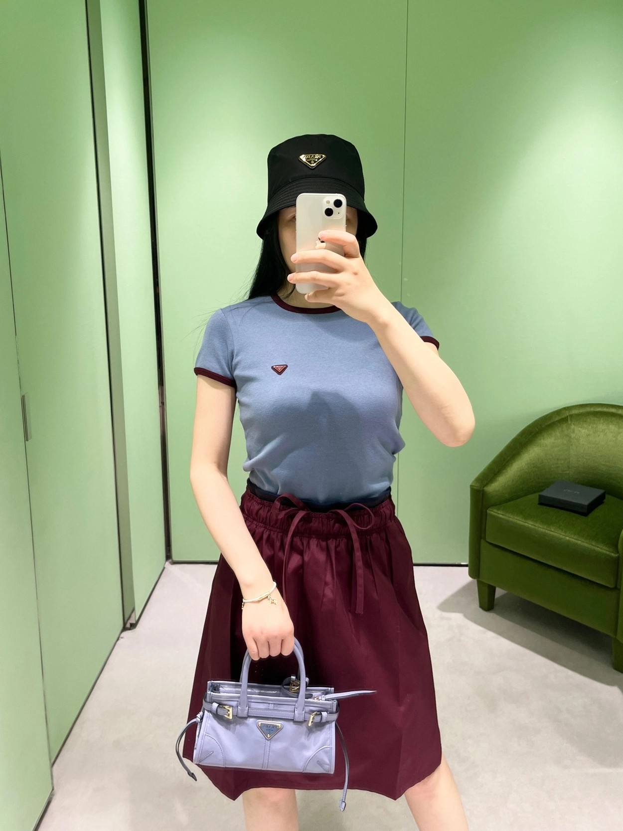 🛒Prad* 26s春夏新款撞色圆领短袖t。Y版定制高克重纯棉材质,厚度适中柔软自然垂坠质感。酒红边饰设计超有辨识度,胸前三角Logo铭牌装饰。修身弹力,上身复古时尚显瘦又气质,单穿打底都适合。