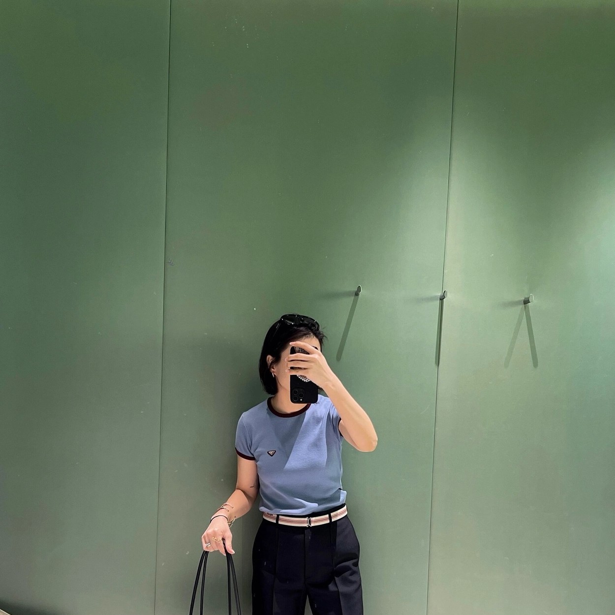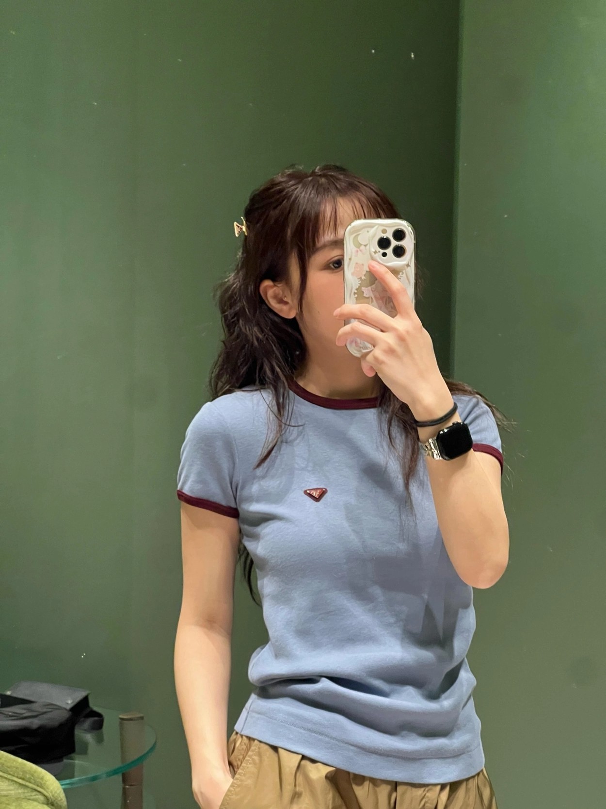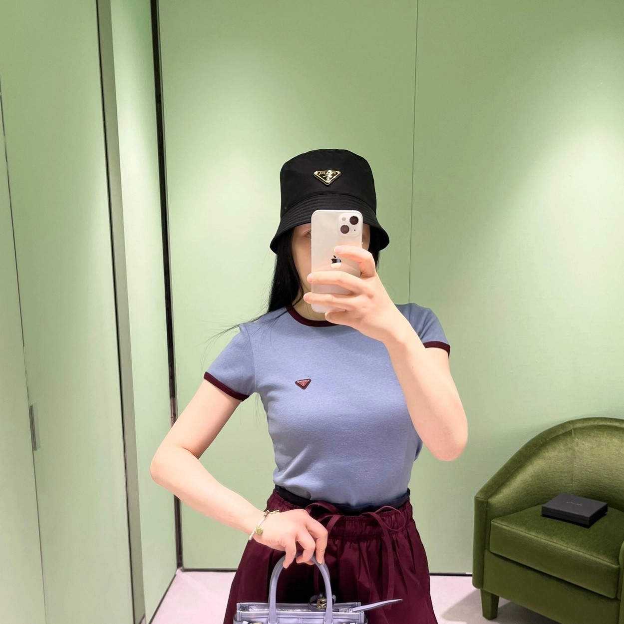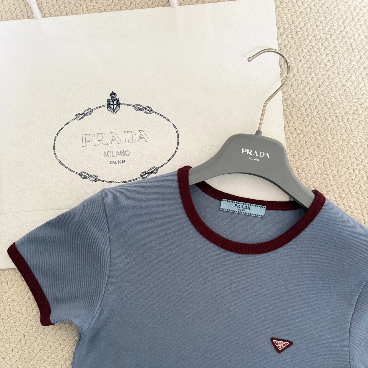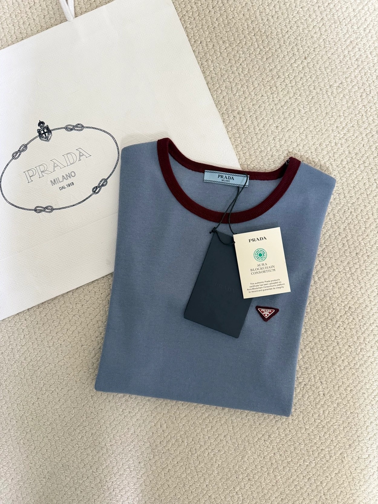 🛒Prad* 26s春夏新款撞色圆领短袖t。Y版定制高克重纯棉材质,厚度适中柔软自然垂坠质感。酒红边饰设计超有辨识度,胸前三角Logo铭牌装饰。修身弹力,上身复古时尚显瘦又气质,单穿打底都适合。