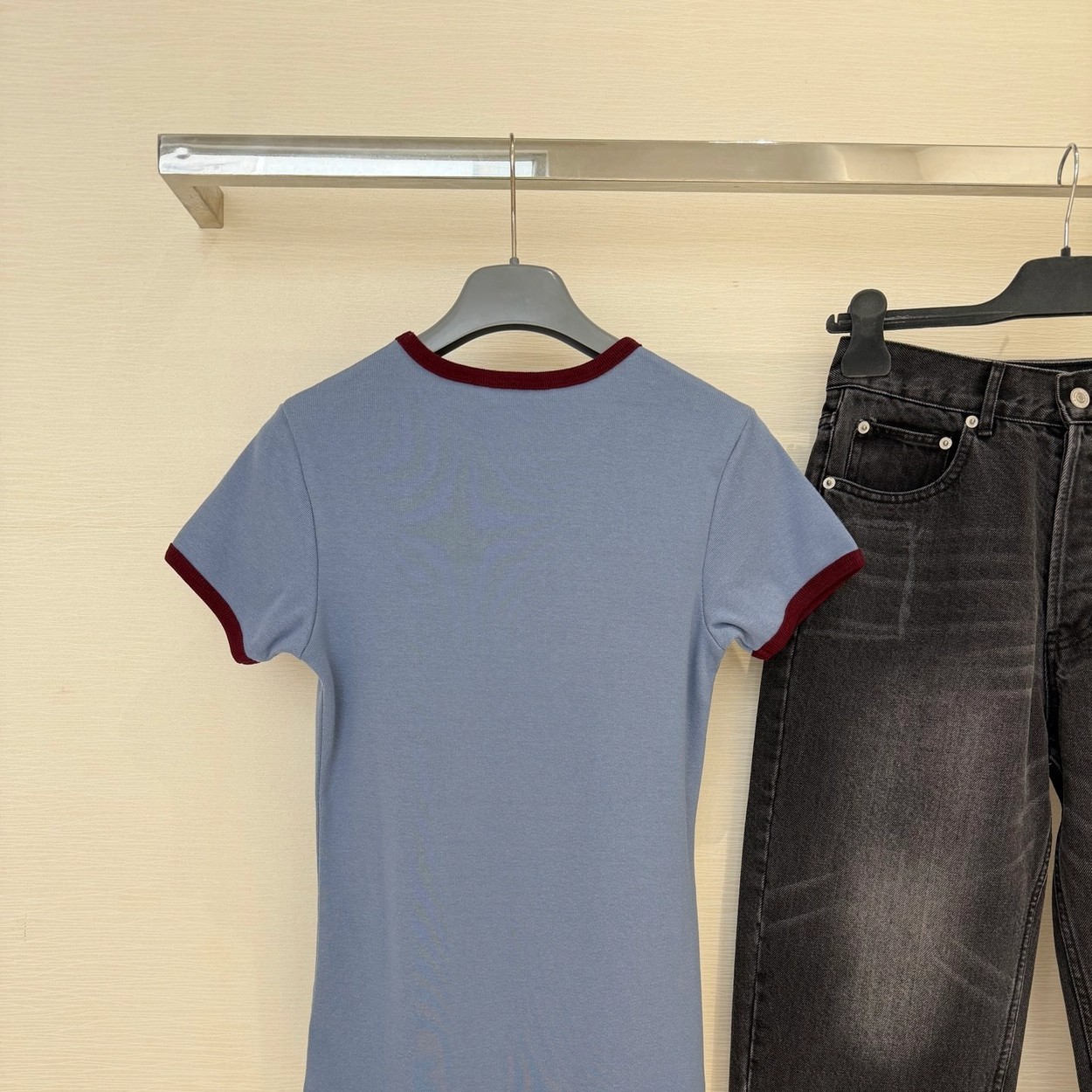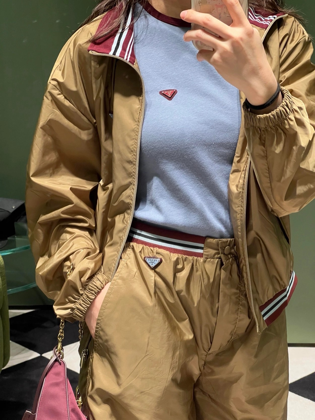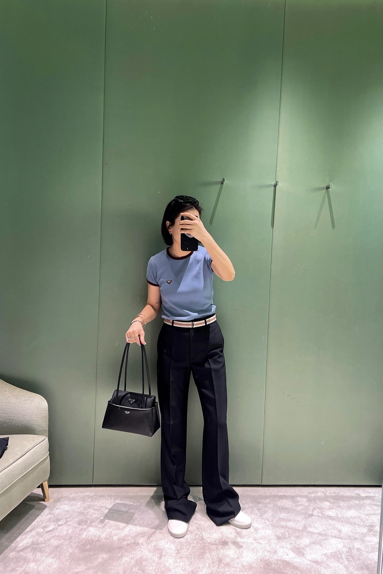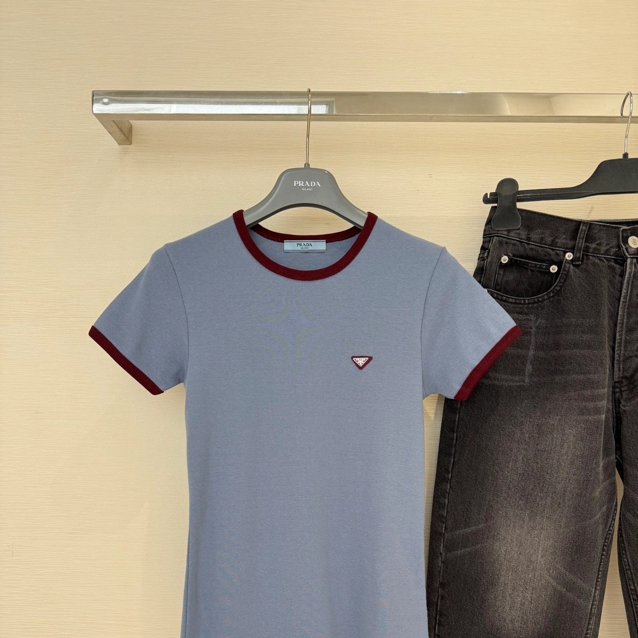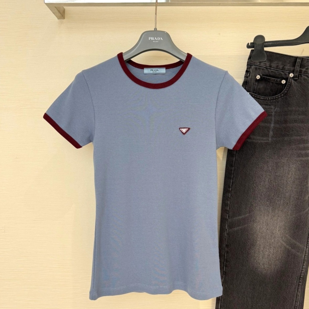 🛒Prad* 26s春夏新款撞色圆领短袖t。Y版定制高克重纯棉材质,厚度适中柔软自然垂坠质感。酒红边饰设计超有辨识度,胸前三角Logo铭牌装饰。修身弹力,上身复古时尚显瘦又气质,单穿打底都适合。